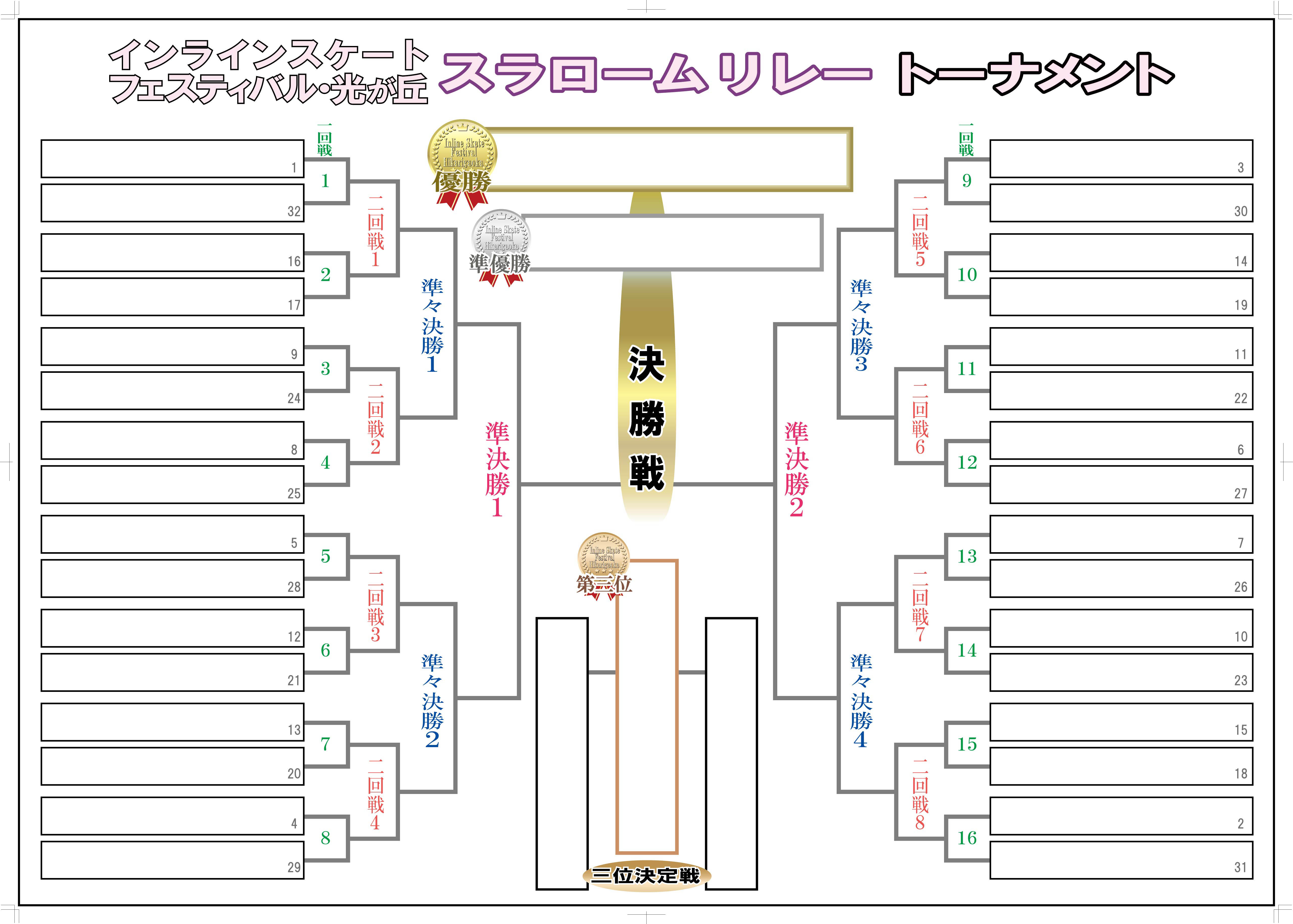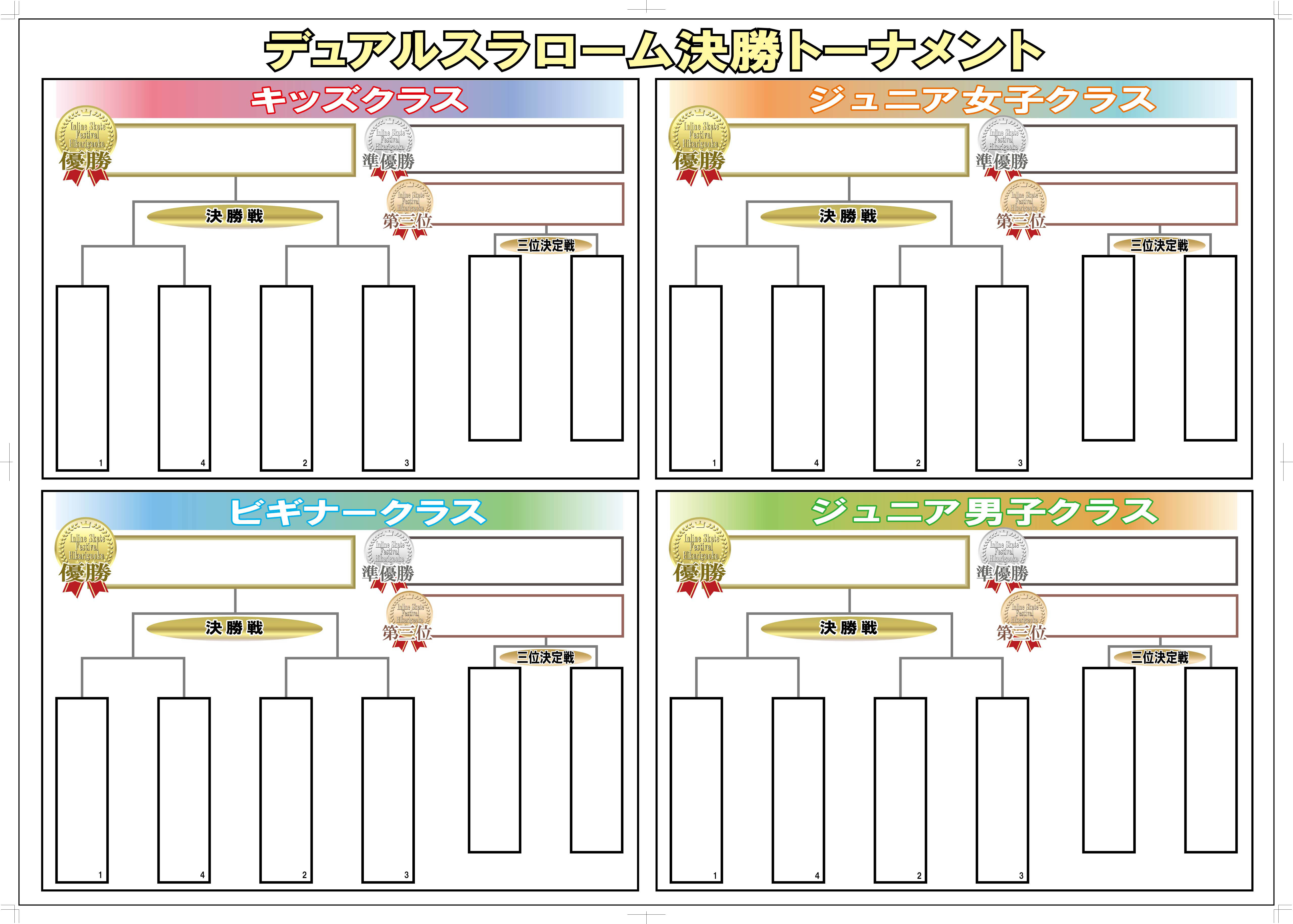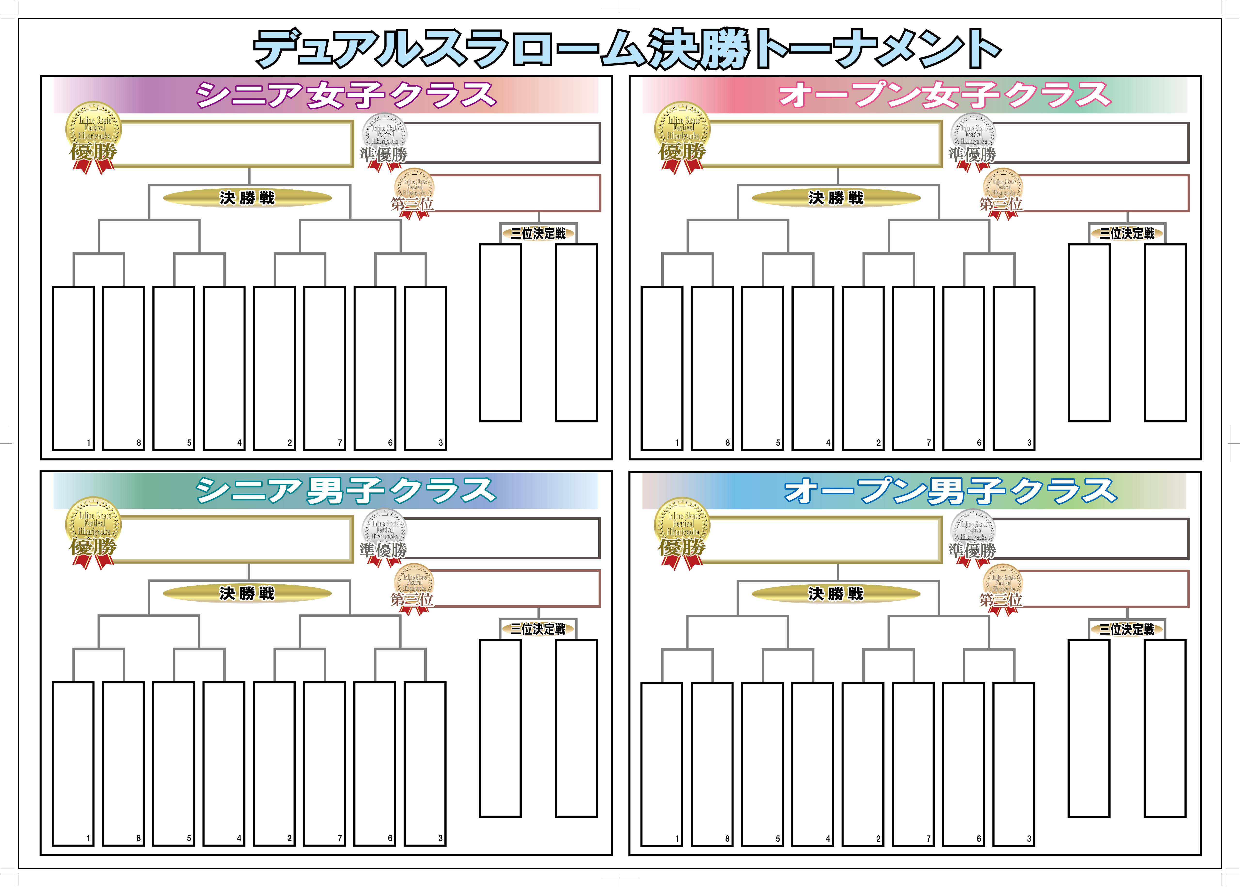 これはスタッフ用のページです。お気付きの点がありましたら、掲示板でお知らせ下さい。 ◆プログラム ・公式サイト(20240818更新) ・ポスター兼チラシ表(じょうすけさん制作)(20231001更新) ・ポスター兼チラシ裏(じょうすけさん制作)(20231001更新) ・タイムスケジュール(エクセル)(20250920更新) ・タイムスケジュール(PDF)(20250920更新) ・全体進行管理(ワード)(20250930更新) ・開会式、閉会式(ワード)(20250930更新) ◆関連書式 ・企画書表紙(エクセル)(20160716更新) ・大会要綱(ワード)(20150718更新) ・全体受付表&リレー受付表(エクセル)(20220911更新) ・デュアルスラローム予選滑走券(エクセル)(20220911更新) ・デュアルスラロームルール(エクセル)(20220911更新) ・滑走券記入要領(エクセル)(20220911更新) ・デュアルスラロームスタッフ(エクセル)(20150718更新) ・フリースタイル審査表(エクセル)(20220911更新) ・ゼッケンシール(エクセル)(20220911更新) ・デュアルスラローム本戦トーナメント表1(20220928更新) ・デュアルスラローム本戦トーナメント表2(20220928更新) ・スラロームリレートーナメント表(20220928更新) ・スラロームリレールール(エクセル)(20220911更新) ・スラロームリレー説明(ワード)(20220911更新) ・受付看板(エクセル)(20220911更新) ・表彰状(ワード)(20220911更新) ・入賞者記入表&賞品一覧(エクセル)(20220911更新) ※スタッフ&スポンサーを募集しています。ご協力頂ける方は相馬までご連絡下さい。 |